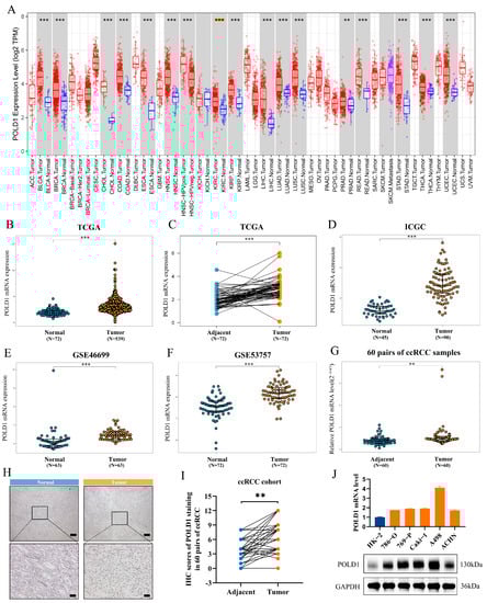 Relationship between POLD1 expression and ccRCC. (A) TCGA database analysis showed the POLD1 expression levels in various cancer tissues and their counterpart normal tissues. Yellow background of *** represent KIRC patients. (B–F) POLD1 expression levels were significantly higher in the ccRCC tissues compared to the counterpart/paired peritumoral normal renal tissues in the (B,C) TCGA, (D) ICGC, (E) GSE46699 and (F) GSE53757. (G) The mRNA level of POLD1 in 60 pairs of ccRCC tissues and their paired normal adjacent tissues. (H,I) POLD1 IHC staining and statistical results show the protein levels of POLD1 in the validation cohort (scale bar, 50 um; magnification, 100× and 200×). (J) The mRNA and protein levels of POLD1 were evaluated in a normal human renal epithelial cell line and RCC cell lines by RT-qPCR and Western blot. Data were shown as mean ± SD. Differences were considered significant at p < 0.05 (** p < 0.01, *** p < 0.001).