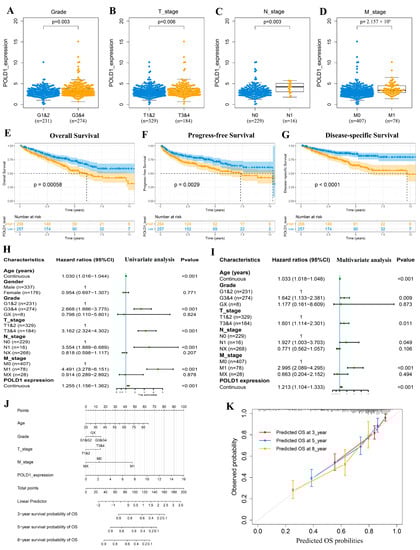 Association between POLD1 expression and the clinical parameters of ccRCC patients and its prognostic significance. (A–D) Relationship of POLD1 mRNA levels with individual cancer stages (T stage, N stage and M stage) and tumor grade of ccRCC patients. (E–G) Relationship of POLD1 expression levels with overall survival (OS), progression-free survival (PFS), and disease-specific survival (DSS) in the TCGA-KIRC cohort. (H,I) Univariate and multivariate survival analyses for selecting prognostic factors. (J,K) Establishment (J) and estimate (K) of the overall survival nomogram for ccRCC patients.