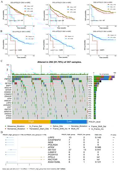 Relationship between somatic mutations and POLD1 expression in ccRCC patients. (A) Kaplan–Meier survival curves show the association between the CNV of the POLD1 gene with the OS, PFS, and DSS rates in ccRCC patients. (B) Kaplan–Meier survival curves show the association between the SNV of the POLD1 gene and overall survival (OS), progression-free survival (PFS), and disease-specific survival (DSS) in ccRCC patients. (C) Somatic mutations in the POLD1-high and POLD1-low expression groups. (D) Comparison of the mutations between the high expression and low expression groups of POLD1. * p < 0.05, ** p < 0.01.