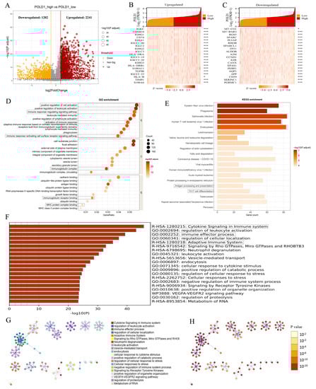 Functional enrichment analysis of the differentially expressed genes (DEGs) based on the POLD1 expression levels in ccRCC. (A) The volcano plot described 3443 DEGs (2241 upregulated and 1202 downregulated genes). (B,C) The heat maps depicted the expression of 20 significant upregulated (B) and downregulated (C) genes in the ccRCC samples with POLD1high and POLD1low expression. (D,E) GO (D) and KEGG pathway (E) enrichment results of DEGs in ccRCC samples with POLD1high and POLD1low expression. (F–H) The functional enrichment of POLD1-associated DEGs also analyzed via Metascape was shown in (F) the bar graph of the top 20 enriched terms, colored by p-value. (G) colored by cluster ID, where nodes with the same cluster ID are usually close to each other; (H) colored by p-value, where the terms containing more genes tend to have greater significance. * p < 0.05, *** p < 0.001.