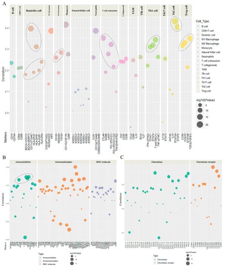 The relationship of POLD1 expression with marker gene sets of immune cells, immunomodulators and chemokines. (A–C) The bubble plot shows the association of the POLD1 gene with the marker sets of 16 diverse immune cells or their status (A); markers of immunomodulators (B); as well as markers of chemokines/chemokine receptors (C).