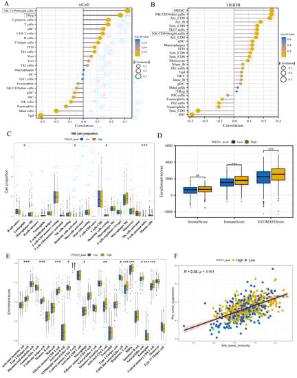 Characteristics of immune cell infiltration in tumors with POLD1 expression. (A,B) The relationship between POLD1 expression and immune cell infiltrates was analyzed by the xCell (A) and TISIDB (B) platforms. (C) Proportions of 22 immune cells in the subgroups (POLD1high and POLD1low) of ccRCC. (D) The tumor immune microenvironment (TME) scores between the POLD1high and POLD1low groups (including stromal score, immune score, and estimate score). (E) Differences in the activities of diverse immune cells between the POLD1high and POLD1low groups. (F) Analysis of the activity of pro-tumor suppression and anti-tumor immunity in the POLD1high and POLD1low groups. ns, No significance, * p < 0.05, ** p < 0.01, *** p < 0.001.