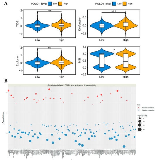The association between POLD1 expression and anticancer drug sensitivity. (A) TIDE score, MSI, T cell Dysfunction and Exclusion in different POLD1 expression groups. (B) Gene-set drug-resistance analysis from GDSC and CTRP IC50 drug data. Spearman’s correlation represents an association between gene expression and the drug. A positive association (red bubbles) means that high gene expression confers resistance to the drug, and a negative one (blue bubbles) means it does not. ns, No significance, * p < 0.05, ** p < 0.01, *** p < 0.001.
