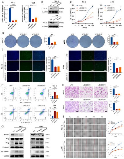 Knockdown of POLD1 inhibited the malignant biological behaviors of ccRCC cells in vitro. (A,B) The level of POLD1 was evaluated by RT-qPCR (A) and Western blot (B) after the knockdown of POLD1 in ccRCC cells. (C–E) The proliferation of ccRCC cells was detected by CCK-8 (C), colony-formation (D), and EdU assays (E). (F,G) Inhibition of POLD1 resulted in increased apoptosis in ccRCC cells via flow cytometry (F) and Western blot assay (G). (H,I) The migration of ccRCC cells was detected by Transwell assay (H) and wound healing assay (I). Differences were considered significant at p < 0.05 (** p < 0.01, *** p < 0.001).