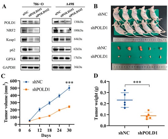 We further explored the role of POLD1 in ccRCC in vitro. The interference efficiency of POLD1 knockdown by siRNA was validated using RT-qPCR and Western blotting in 786-O and A498 cells (Figure 8A,B). The results of the CCK-8, EdU, and colony formation assays all showed that the knockdown of POLD1 significantly inhibited the proliferation ability of the 786-O and A498 cells (Figure 8C–E). Further, the flow cytometry results showed that a significantly higher proportion of apoptotic cells in POLD1 knockdown ccRCC cells, and the Western blot also detected a marked increase in the apoptosis-related protein PARP and Caspase-3 spliceosomes (Figure 8F,G). The above results verified that the knockdown of POLD1 promoted the ccRCC cells’ apoptosis. In addition, POLD1 knockdown also significantly inhibited the migratory ability of the ccRCC cells, as evidenced via the Transwell and wound healing assays (Figure 8H,I). To further explore the mechanisms through which POLD1 regulates the ccRCC anti-tumor immune response, we detected the impact of POLD1 on several oncogenic signaling pathways using a Western blot. The results demonstrated that POLD1 knockdown in 786-O and A498 cells significantly decreased the levels of autophagy and ferroptosis signaling pathway-related genes, including p62, NRF2, Keap1 and GPX4 (Figure 9A). Finally, depletion of POLD1 also inhibited tumor growth in the xenograft mouse model (Figure 9B–D). Taken together, POLD1 facilitated the proliferation and migration, and inhibited the apoptosis in ccRCC cells in vitro and in vivo, as well as influenced the activation of oncogenic signaling.