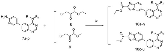 Procedure for the Preparation of Ethyl 6-(4-((4-Methoxybenzyl)amino)quinazolin-6-yl)imidazo[1,2-a]pyridine-2-carboxylate (10a) or Methyl 6-(4-((4-methoxybenzyl)amino)quinazolin-6-yl)imidazo[1,2-a]pyridine-2-carboxylate (10o)