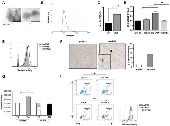 Exosomes are now recognized as important components of senescent cell’s secretome; still, their role in the phenomenon of bystander senescence remains largely unexplored. Several studies have shown that stress conditions as well as chemotherapeutic treatments can stimulate exosome secretion from cancer cells. For this reason, we isolated exosomes from the conditioned media of untreated or drug-exposed SKO-007(J3) MM cells as previously reported [] and characterized them by transmission electron microscopy showing the presence of nano-sized cup shaped vesicles (Figure 1A). Furthermore, we employed dynamic light scattering (DLS) methodology to estimate vesicle size distribution, measuring an average diameter of 96 ± 8 nm (Figure 1B). Accordingly, as previously demonstrated upon MEL treatment [] we measured increased amounts of exosomes from DOX-treated MM cells (Figure 1C).