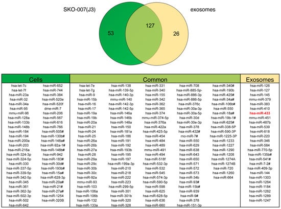 miRNA profiling of MM cell-derived exosomes and parental SKO-007(J3) cells. Total RNA was isolated from both SKO–007(J3) cells and SKO-007(J3)-derived exosomes and analyzed for microRNA expression profiling using Megaplex Pool cards A and B, as described in Materials and Methods. The Venn diagram was created using an online program (http://www.bioinformatics.lu/venn.php, accessed on 1 April 2023), and the data are reported in the table. In the left column of the table, the miRNAs expressed only in SKO-007(J3) cells are shown, the central column displays the miRNAs present in both SKO-007(J3) cells and SKO-007(J3)-derived exosomes and the right column shows those expressed only in SKO-007(J3)-derived exosomes. The results of the representative experiments are shown.