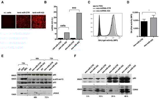 As shown in Figure 4C,D, exosomes derived from miR-433 infected cells were able to trigger a senescent phenotype upon 24 h of incubation without triggering DDR, since the protein levels of p53 and p21, as well as p53 phosphorylation on Ser15 and histone H2AX phosphorylation (γH2AX), were comparable between exo-miR-CTR- and exo-miR-433-stimulated cells (Figure 4E). As a control, we stimulated cells with DOX and MEL, which, as already described [], induced DDR activation. The densitometric analysis is reported in Table S1.