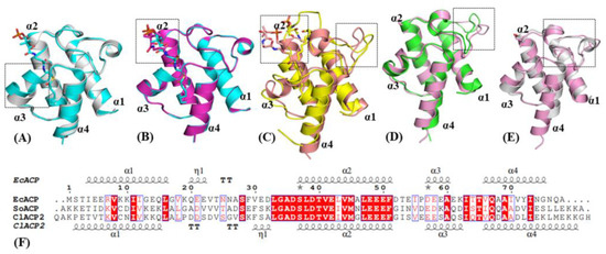 Comparisons of the structures and sequences of ACPs. (A) Structure overlay of EcACP by apo form (PDB entry 1T8K, colored gray) and C7-acylation form (PDB entry 2FAD, colored cyan). (B) Structure overlay of EcACP by C7-acylation form and C10-acylation form (PDB entry 2FAE, colored purple). (C) Structure overlay of SoACP by C10-acylation form (PDB entry 2FVF colored salmon) and C18:0-acylation form (PDB entry 2FVA, colored yellow). (D) Overlay of SoACP (PDB entry 2FVE, colored green) and ClACP2 (colored pink). (E) Overlay of EcACP by apo form and ClACP2. (F) Sequence comparison of EcACP, SoACP, and ClACP2. The red boxes show the 100% conserved residues; residues having similar properties are shown in blue boxes.