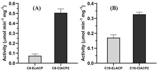 Relative activity of ChFatB2 with acyl-ACPs. (A) Relative activity of ChFatB2 with C8-EcACP and C8-ClACP2 as the substrate. (B) Relative activity of ChFatB2 with C10-EcACP and C10-ClACP2 as the substrate.