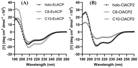 The enzymatic results clearly demonstrated that the acyl preference of ChFatB2 switched from C8 to C10 when using ClACP2 as the carrier protein instead of EcACP and suggested that modification of the ACP portion would contribute to the acyl chain preference of the thioesterase. It was assumed that the conformational changes of the entire acyl-ACP, particularly the changes of the ACP portion, were the principal reason. Due to the unique and conserved helix structure of ACP, circular dichroism provides a reliable scheme for studying the structural changes. The double minima at 208 nm and 222 nm were determined for all holo- and acyl-ACPs from 190 to 260 nm, as shown in Figure 3, confirming the characteristics of the α-helix structure in the CD spectra.
