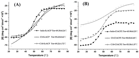 Melting temperature curves of ACP. (A) The thermal-induced melting temperature curves of holo-, C8- and C10-EcACP. (B) The thermal-induced melting temperature curves of holo-, C8- and C10-ClACP2.