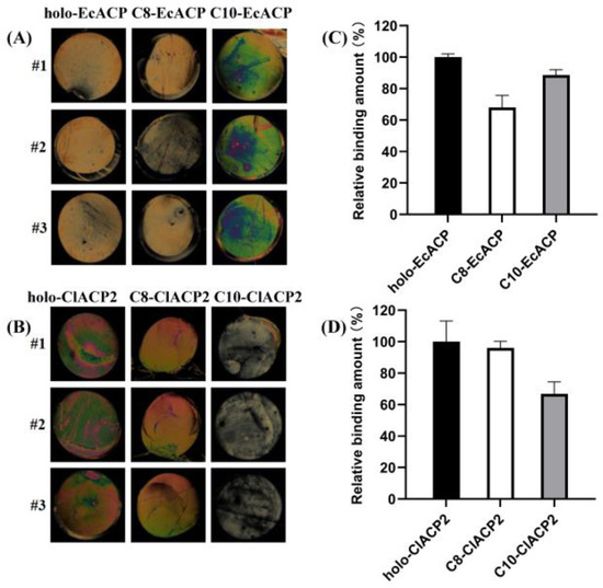 The immobilized ChFatB2 was incubated with different acyl- and holo-ACPs. After rinsing, the optical images of liquid crystal cells in Figure 5A,B showed that the different circular regions display different optical brightness under polarized light microscopy. This indicated that the orientations of liquid crystals in different regions were different, which may be caused by the amount of absorbed ACPs. Because the immobilized ChFatB2 was the same for each circular region, the difference of the absorbed ACPs may be attributed to their binding capability with ChFatB2. The relative binding capacity of ChFatB2 to ACP was evaluated by the grayscale of the optical image of liquid crystal cells shown in Figure 5C,D. The average of the grayscale in the holo-EcACP-deposited region was 155.7 ± 3.2 and defined as 100% binding with ChFatB2. The grayscale values in C8-EcACP- and C10-EcACP-deposited regions were 106.1 ± 11.8 and 138.1 ± 5.3, respectively, and corresponded to 68.1% and 88.6%, compared with the holo form. Compared to the binding of C10-EcACP and holo-EcACP with ChFatB2, the C8-EcACP with conformational changes presented lower binding, which is consistent with the study above. With regard to ClACP2, the grayscales of the optical images in holo-, C8-, and C10-deposited regions were 144.7 ± 19.1, 139.1 ± 6.0, and 96.7 ± 11.0 and calculated to 100%, 96.1%, and 66.8% binding, respectively. Similarly, the C10-ClACP2 that carries conformational changes presented a decline in binding compared to C8-ClACP2 and holo-ClACP2.