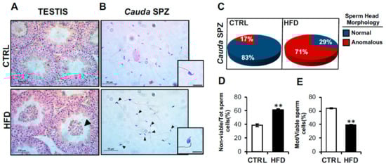 Then, we examined the main sperm parameters fundamental for a successful fertilization process. Interestingly, HFD impaired sperm motility, as well as viability and head morphology. Accordingly, a correlation between testicular oxidative stress and/or inflammation and sperm head morphology has been reported [11] as well as sperm structural anomalies in various HFD-fed mice models [49,50].