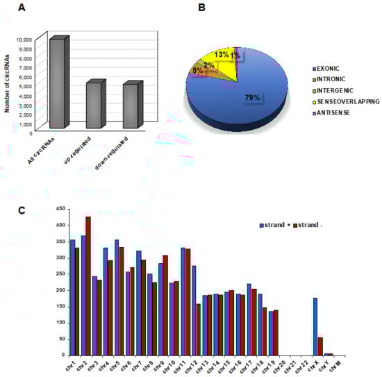 Overview of circRNA expression in mouse SPZ. (A) The distribution of up- and downregulated circRNAs in HFD (n = 3) compared with CTRL (n = 3) SPZ among a total of 9838 circRNAs. (B) The proportion of different types of circRNAs among all predicted circRNAs. (C) Chromosomal distribution of SPZ-derived circRNAs on strand + and strand –, according to their host gene location.