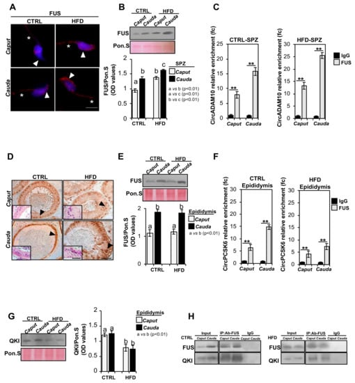 Considering that FUS physically interacts with QKI to perform a successful backsplicing reaction [29], we investigated the QKI protein content in total lysates of caput and cauda epididymis derived from CTRL and HFD mice by Western blot analysis. As reported, QKI levels were constant from caput to cauda epididymis in both experimental groups; however, a significant reduction of QKI in caput and cauda HFD epididymis (p < 0.01) was observed when compared with CTRL one (Figure 5G).