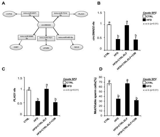 In vitro experiment of vesicle shuttle: from CTRL epididymis to HFD SPZ. (A) CeRNET of one circRNA downregulated in HFD SPZ. CircSMAD2 tethers a group of miRNAs as targets, all involved in sperm motility pathways. Networks were built using Cytoscape. Hexagonal and rectangular symbols represent circRNAs and miRNAs, respectively. The arrow indicates the tethering activity of circRNAs toward miRNAs, while the dotted arrow indicates the pathways upstream of the miRNAs. (B,C) qRT-PCR analysis of circSMAD2 (B) and PLAG1-mRNA (C) in CTRL cauda SPZ and HFD cauda SPZ in vitro coincubated with: PBS, CTRL-ELF, and CTRL-ELF pretreated with anti-CD9 antibody (n = 6 for each experimental group). qRT-PCR data were normalized using cyclophilin, expressed as fold expression (nfe) relative to CTRL SPZ and reported as mean value ± S.E.M. Experimental groups with statistically significant differences (p < 0.01) were indicated with different letters. (D) Sperm motility assay in CTRL cauda SPZ and HFD cauda SPZ in vitro coincubated with: PBS, CTRL-ELF, and CTRL-ELF pretreated with anti-CD9 antibody (n = 6 for each experimental group); data were expressed as the percentage of motile/live SPZ and reported as mean ± SEM. Experimental groups with statistically significant differences (p < 0.01) were indicated with different letters.