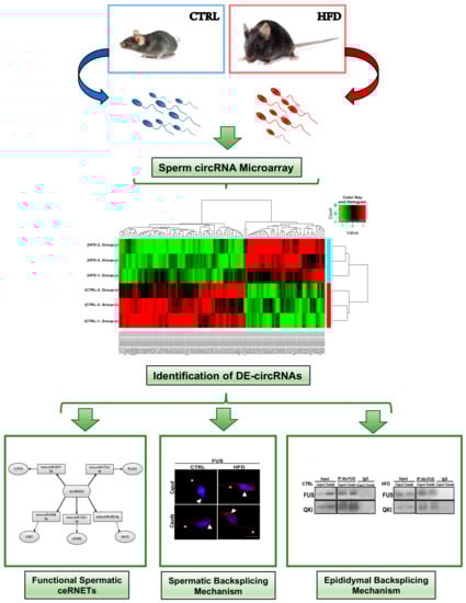 In the current work, in order to shed light on a putative association between obesity and spermatic circRNA cargo, we carried out a fine microarray analysis on total epididymal SPZ collected from control (CTRL) and HFD mice. Spermatic DE-circRNAs were identified, and an anomalous backsplicing mechanism in both HFD SPZ and epididymis was highlighted. Then, in order to suggest that DE-circRNAs may be key regulators of HFD altered sperm motility, we carried out a vesicle shuttle in vitro experiment focused on a circSMAD2-dependent regulatory pathway.