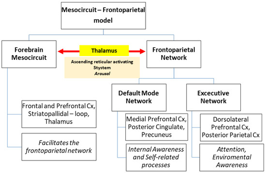 Wakefulness depends on the proper functioning of an intricate system of serotonergic, dopaminergic, adrenergic, and cholinergic neurons located mainly in the brainstem: the ascending reticular activating system (ARAS) [1]. ARAS diffusely projects to the thalamus and cerebral cortex. It facilitates the proper and synchronous functioning of the anterior forebrain mesocircuit and the frontoparietal network, both of them essential for awareness [2] (Figure 1). In particular, the anterior forebrain mesocircuit includes the frontal and prefrontal cortex, striatopallidal—loop, and thalamus, and plays a key role in facilitating the frontoparietal network [3]. The frontoparietal network is divided into the default mode network and the executive network. The default mode network comprises regions from the medial prefrontal cortex, posterior cingulate cortex, and precuneus, and it is essential for internal awareness and self-related processes [4]. The executive network depends on regions from the dorsolateral prefrontal cortex and posterior parietal cortex, and it is central for attention and environmental awareness [5].