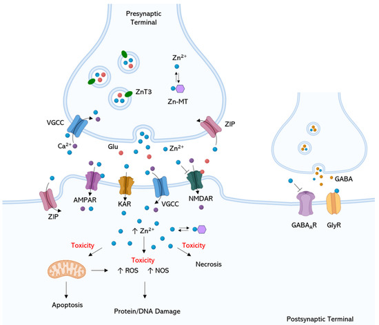 Physiological and pathological neuromodulation of Zn-containing pre- and postsynaptic neurons. Most vesicular Zn co-localizes with glutamate in subsets of glutamatergic zinc-enriched neurons, and it is also contained in the synaptic vesicles of subpopulations of glycinergic and GABAergic neurons. Zn2+-level regulation between cellular compartments, organelles, and extracellular space is ensured by ZIP and ZnT protein families, and by metallothioneins (MTs), which buffer cytoplasmic Zn2+, functioning as a temporary store for cellular Zn2+. In the presynaptic terminals, Zn2+ is transported into presynaptic vesicles by the Zn transporter ZnT3. During synaptic transmission, free Zn is released in the synaptic cleft, where it may be recycled back into the presynaptic boutons by ZIP/Zn2+ transporters or modulate excitatory (NMDA, AMPA) and inhibitory (GABA, glycine) amino acid receptors of the postsynaptic terminal; Zn can inhibit GABAAR and NMDAR, and potentiate/inhibit AMPAR and GlyR at low/high concentrations, respectively. Extracellular Zn can also alter the excitability of neurons through effects on voltage-gated ion channels (e.g., VGCC), affecting ions’ influx and neurotransmitter release. Ion channels and AMPAR/KAR allow synaptically released Zn to enter presynaptic and postsynaptic neurons to modulate intracellular Zn signaling functions. Excessive Zn2+ accumulation inside postsynaptic cells, as per excitotoxic stimulation, can lead to a series of toxic effects involving mitochondrial dysfunction and ROS/NOS production, eventually leading to oxidative damage to proteins and DNA, neuronal apoptosis, and/or necrosis. Glu, glutamate; GABAAR, GABA A receptor; NMDAR, NMDA receptor; AMPAR, AMPA receptor; GlyR, glycine receptor; VGCC, voltage-gated calcium channel; KAR, kainate receptor.