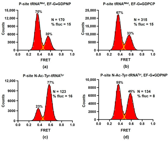 Next, we tested whether EF-G interacts with ribosomes containing peptidyl-tRNA in the P site. When EF-G•GDPNP was incubated with ribosomes containing peptidyl-tRNA analogue N-Ac-Tyr-tRNATyr in the P site, the fraction of ribosomes in the NR (0.6 FRET) conformation decreased from 77 to 45% (Figure 2c,d). This result indicates that EF-G interacts ribosomes containing peptidyl-tRNA in the P site and switches some of them from the NR to R conformation.
