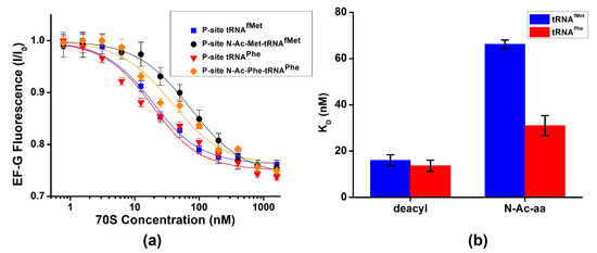 Deacylation of P-site tRNA moderately enhances EF-G binding. (a) EF-G fluorescence (I) normalized to fluorescence observed in the absence of the ribosome (I0) was measured with increasing concentrations of ribosome complex P-site tRNAfMet (blue), N-Ac-Met-tRNAfMet (black), tRNAPhe (red) or N-Ac-Phe-tRNAPhe (orange). (b) Dissociation constants (KD) of EF-G binding determined using fluorescein quenching by ribosomes that contain in the P site either deacyl- or N-Ac-aminoacyl-tRNAs.