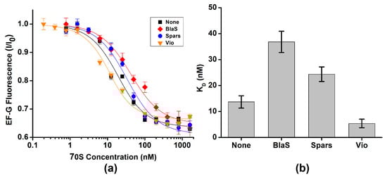 Antibiotics known to perturb the NR↔R equilibrium mildly affect EF-G binding. (a) EF-G fluorescence (I) normalized to fluorescence observed in the absence of the ribosome (I0) was measured with increasing concentrations of ribosome complexes containing P-site tRNAPhe in the presence of 200 μM blasticidin S (BlaS, red), 40 μM sparsomycin (Spars, blue), 500 μM viomycin (Vio, orange) or in the absence of antibiotics (none, black). (b) Dissociation constants (KD) of EF-G binding determined in the presence or absence of antibiotics.