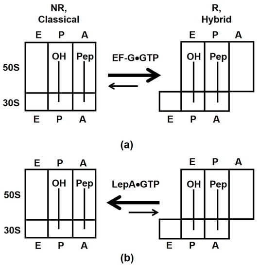 - Rexroad, G.; Donohue, J.P.; Lancaster, L.; Noller, H.F. The role of GTP hydrolysis by EF-G in ribosomal translocation. Proc. Natl. Acad. Sci. USA 2022, 119, e2212502119. [Google Scholar] [CrossRef]