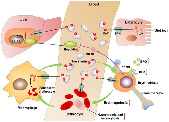 Iron homeostasis in iron deficiency. Most iron in the body is involved in the process of erythropoiesis, phagocytosis, and dissolution of senescent erythrocytes by macrophages (light green arrows). Hepcidin, produced and secreted by hepatocytes, is the master regulator of systemic iron metabolism. In iron deficiency, the transcription of the hepcidin-encoding gene, HAMP, is down-regulated. Low hepcidin levels increase recycling by macrophages and iron absorption by enterocytes by increasing the activity of iron exporter ferroportin (FPN). Low hepcidin levels also lead to the efflux of iron from erythroblasts via FPN, which further reduces the intracellular iron availability of erythroblasts. Iron deficiency stimulates erythropoiesis by enhancing the production of erythropoietin (EPO) and erythroblastic EPO sensitivity via the genetic loss of the EPO receptor (EPOR) partner transferrin receptor 2 (TfR2). The increase in erythropoiesis and the decrease in iron supply in erythroblasts lead to an increase in erythrocytes with hypochromia or microcytosis. Erythroferrone (ERFE), a hormone that EPO stimulates erythroblasts to produce, can also inhibit the production of hepcidin. The red up arrows mean elevation; The red down arrows mean lowering; Black arrows represent hepcidin-FPN axis-regulated iron homeostasis; Purple arrows represent erythroblast-regulated hepcidin expression; Green arrows represent the iron cycle during erythropoiesis.