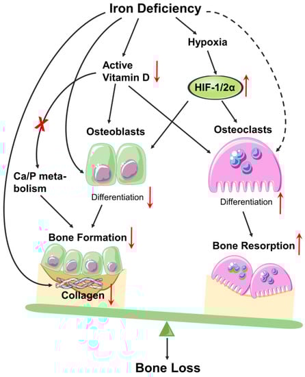 Iron deficiency or IDA can affect many organ functions of the human body. For example, IDA is related to functional impairment that affects cognitive development [], immune mechanism [], and physical work capacity []. The relationship between iron deficiency and bone health comes from clinical observations in IDA patients who suffered bone loss [,]. In addition, low iron in diet is also associated with bone loss []. In this review, relevant studies on iron deficiency and bone loss are discussed, and the potential mechanisms of iron deficiency leading to bone loss are analyzed.