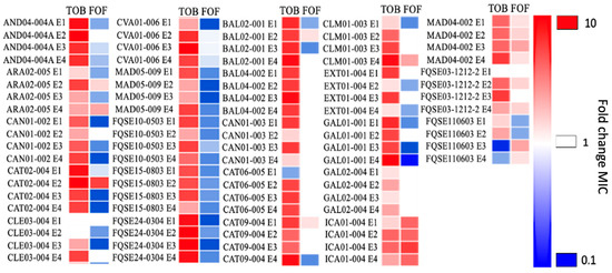 Diagram showing the susceptibility to tobramycin and fosfomycin in clinical isolates of P. aeruginosa subjected to short-term ALE in the presence of tobramycin. Susceptibility to tobramycin and fosfomycin was analyzed in 23 clinical isolates (reported in Table 1), 4 replicate populations each—indicated as E1, E2, E3, or E4—subjected to ALE in the presence of tobramycin for three days. Intensity of the color is proportional to fold change of MIC regarding the mean value of the control populations’ MIC. The evolved populations were classified as “resistant” (red) or “susceptible” (blue). Collateral sensitivity to fosfomycin was observed in nine out of the 23 clinical isolates of P. aeruginosa. MIC values (μg/mL) of parental strains and populations evolved in the presence/absence of tobramycin, are included in Table S2. TOB: tobramycin, FOF: fosfomycin.