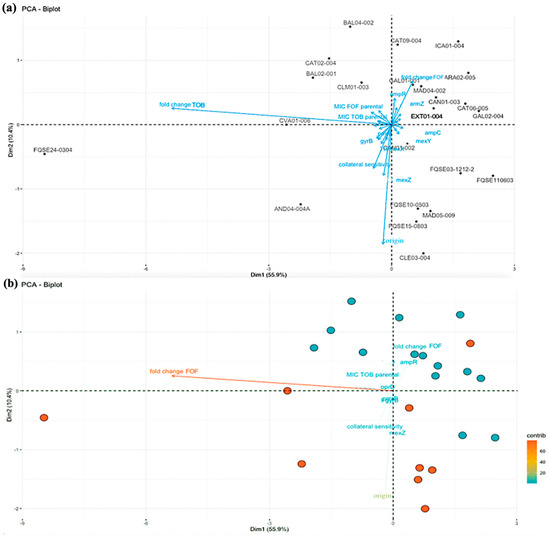 Biplot of Principal Component Analysis of the variables that may influence fosfomycin collateral sensitivity in P. aeruginosa clinical isolates. (a) In the biplot above the names of clinical isolates and all the variables analyzed are reported. (b) In the biplot below the orange points are the strains that developed collateral sensitivity to fosfomycin, while the blue ones are the strains that did not, both after ALE in the presence of tobramycin. In this biplot, only the 10 most influent variables are showed, from the most influential in orange, to the least influential, in blue. The PCA permits to express the information as a set of new variables called principal components; this results in a two-dimension representation (Dim1 and Dim2) of the contribution of all the variables in the division of the strains in two groups. All the variables analyzed by PCA are described in Materials and Methods.