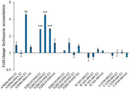 Intracellular active fosfomycin accumulation in populations evolved in the presence of tobramycin from diverse P. aeruginosa clinical strains. Fold change of the amount of accumulated active fosfomycin per CFU after incubation of bacteria with 2 mg/mL of the antibiotic in replicate populations evolved in the presence of tobramycin from AND04-004A, FQSE24-0304, FQSE10-0503, ICA01-004 and CAT09-004 strains respect to their respective control—evolved in the absence of antibiotic—populations is represented. The amount of active intracellular fosfomycin is estimated regarding the hallo produced by a disk soaked with the intracellular content of the tested population in a plate seeded with E. coli OmniMAXTM. Error bars indicate standard deviations of the results from three biological replicates. Statistically significant differences were calculated with t-test for paired samples assuming equal variances: ** p < 0.005, *** p < 0.0005.