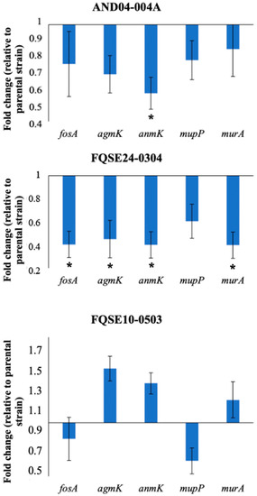 It has been described that increased susceptibility to fosfomycin can be caused, among other mechanisms, by a reduced expression of (i) fosA, a gene coding for the fosfomycin-inactivating enzyme, which is intrinsic in P. aeruginosa [22,23]; (ii) genes from the alternative peptidoglycan-recycling pathway, as agmK, anmK and mupP [26]; and (iii) murA, which encodes a UDP-GlcNAc enol-pyruvyl transferase, important for peptidoglycan synthesis and also the target of fosfomycin, which binds irreversibly to its active site [44]. Thus, with the aim of delving into the reasons behind fosfomycin collateral sensitivity observed in several P. aeruginosa clinical isolates, the expression of fosA, agmK, anmK, mupP, and murA was measured in individual clones from evolved populations which showed collateral sensitivity to fosfomycin upon evolving in the presence of tobramycin. Specifically, the evolved populations E4 of AND04-004A, E2 of FQSE24-0304, and E3 of FQSE10-0503 (see Table S2) were chosen for gene expression analysis, in order to understand alternative mechanisms of fosfomycin collateral sensitivity beyond an increased fosfomycin accumulation in the first case, or further mechanisms in combination with the increased accumulation for the other one (see above). The results, encompassed in Figure 4, showed that the clone derived from the AND04-004A presented a reduced expression of genes from the peptidoglycan-recycling pathway, i.e., agmK, with a 0.69-fold change expression with respect to the parental strain; and anmK, with an expression significantly lower than the parental one (0.57-fold). The clone derived from FQSE24-0304 presented a statistically significant reduction in the expression of fosA, anmK, and murA in a 0.4-fold change and of agmK in a 0.45-fold change, compared to the parental strain. In addition, the reduced expression of mupP, though not statistically significant, was reported with a fold change of 0.61 respect to the parental strain. Notably, the clone derived from FQSE10-0503 presented a reduced expression of mupP, with a fold change of 0.64 the parental one, while the expression of the other genes did not change.