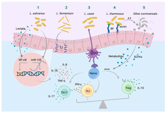 Graphical illustration to summarize some of the mechanisms employed by Lactobacillus species to modulate the immune system. (1) Regulation of miRNAs that affect cytokine gene expression and production of lactic acid, which affects the transcriptional regulator NF-κB, where both effects downregulate the production of proinflammatory mediators such as IL8 and TNF-α. (2) Upregulation of the tight junction’s (TJ) expression enhances the gut barrier and prevents leakage of metabolites that can cause inflammation. (3) Enhancement of the differentiation of naïve T cells into Treg cells, subsequently leading to higher production of the anti-inflammatory cytokine IL-10. (4) Expression of lectin-GR-1, which is a surface protein that binds to glycoprotein (gp), increasing adherence to the mucosa and leading to better protection and less inflammation. (5) Enhancement of other commensal microbes, such as those that produce anti-inflammatory molecules or short-chain fatty acids (SCFAs).