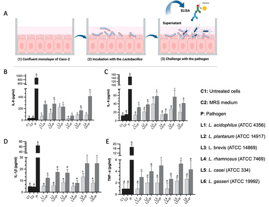 Immunomodulatory activity of 6 Lactobacillus strains from different species in a co-culture experimental model using Caco-2 cell lines. (A). Graphical illustration demonstrating the co-culture experimental design, which consists of three steps: (1) obtaining a confluent monolayer of Caco-2 cells, (2) incubation with each Lactobacillus strain, and (3) challenge with the pathogen to mimic the natural protective mechanism. (B–E). Graphs show the concentration of secreted cytokines in the cell supernatant with each treatment, as measured using ELISA kits for IL-8, IL-6, IL-1β, and TNF-α, respectively. In each graph, black bars represent the controls, where C1 represents untreated cells, C2 represents MRS medium used in bacterial culture, P represents the pathogen only, light gray bars represent inoculation with each strain without a further challenge with the pathogen (strains are labeled L1 to L6), and dark gray bars represent the co-incubation of each strain and the pathogen. Each measurement was performed in triplicate, and results are shown as mean ± SD. Different letters indicate significant differences at p < 0.05.
