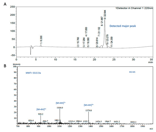 The analysis of the most active fraction using LC/MS-MS revealed a major peak with an MWT of 5515 Da and MS-MS data indicative of a peptide compound. To predict the possible sequence of this peptide, we used DeepRipp software (https://openebench.bsc.es/tool/deepripp accessed on 3 January 2022). DeepRipp is a deep learning algorithm that predicts modified and unmodified microbial peptides from genomic or metagenomic sequences. After the genome has been uploaded to the software, the results are displayed as a list of predicted sequences, confidence scores, and similarity scores compared to previously known peptides. Thereafter, the software links the predicted sequences to potential ions in the LC/MS-MS data. Using the whole genome sequence of the L. rhamnosus strain, DeepRipp revealed a possible peptide with a sequence of MNKLNEVELSKISGGIGPLVIPVAAILGFLATDAWNHADELVAGVKQGWERS. To confirm the identity of the peptide, we synthesized the compound using Genscript Inc. (Piscataway, NJ, USA), and then performed a detailed biological evaluation of the peptide, including immunomodulatory, antibiotic activity, and cytotoxicity test.