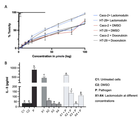 Minimal cytotoxicity of lactomodulin against two colon cell lines and reduction in IL-8 secretion. (A) determination of IC50 of lactomodulin in HT-29 and Caco-2 cell lines. (B) Determination of the most effective dose of lactomodulin in reducing IL-8 secretion, where X1–X4 represent lactomodulin at different concentrations of 50, 10, 1, and 0.5 μmol, respectively. Each measurement was performed in triplicate, and results are shown as mean ± SD. Different letters indicate significant differences at p < 0.05.