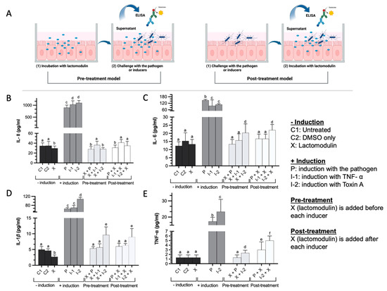 Potent anti-inflammatory activity of lactomodulin in Caco-2 cell line model system. (A) Graphical illustration shows the two different experimental designs: the pre-treatment model in which the cells are first treated with the compound and then the pathogen, and the post-treatment model in which the cells are first challenged with the pathogen or inducers and then treated with the compound. (B–E) Graphs showing the effect of lactomodulin on the 4 measured cytokines. Each graph shows 4 groups of data: (1) black bars: cells without inducers; (2) dark gray bars: cells challenged with the pathogen (P), TNF-α (I-1, 20 ng/mL), and Toxin A (I-2, 10 ng/mL); (3) light gray bars: pre-treatment; and (4) whitish bars: post-treatment data. Each measurement was performed in triplicate, and results are shown as mean ± SD. Different letters indicate significant differences at p < 0.05.
