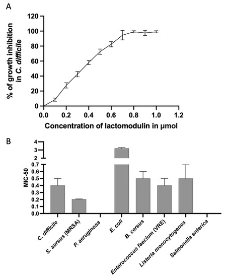 Lactomodulin exerts antibiotic-like action against a broad range of human pathogens. (A) MIC50 of lactomodulin in C. difficile with % of growth inhibition at different concentrations. (B) The activity spectrum of lactomodulin in some human pathogens with broad activity against Gram-positive bacteria, including antibiotic-resistant strains. All data shown are averages of 3 replicated independent experiments.