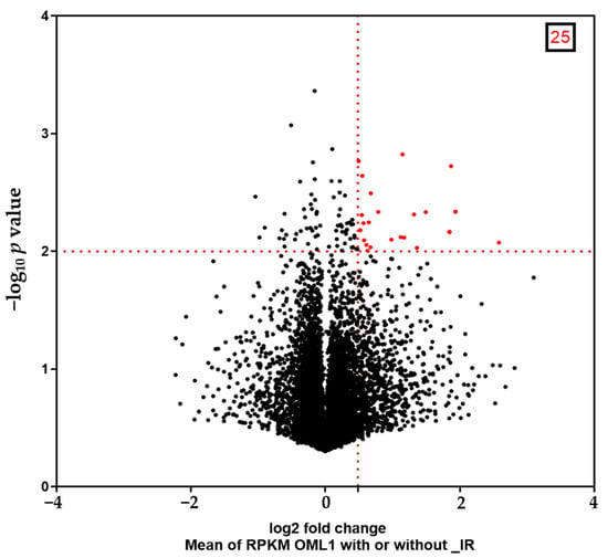 Volcano plot illustrates genes differentially expressed in untreated and ionizing radiation (IR)-treated OML1 cell sub-lines. Twenty-five genes are statistically significantly upregulated (red). The x-axis is the log2 fold change, and the y-axis is the log10 p-value. Abbreviation: RPKM, reads per kilobase per million mapped reads.