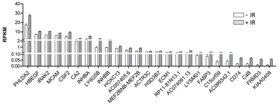 IRAK2 is induced by ionizing radiation in OML1 cells. Expression of post-irradiation upregulated genes. The mean expression of the 25 most significantly upregulated genes in IR-treated OML1 cells compared to non-treated cells. The plot shows the RPKM values for each transcript in two independent replicated experiments.