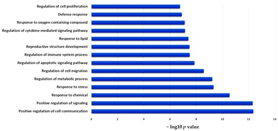 As derived from the volcano plot in Figure 1, Figure 2 depicts the expression levels of the 25 post-IR upregulated genes, including PHLDA2, HBEGF, IRAK2, MCAM, CSF2, CA2, INHBA, LY6G5B, INHBB, HOXC13, AC007405.6, MEF2BNB-MEF2B, ACTR3C, HSD3B7, ECM1, RP11-81N13.1, AC074091.13, LYSMD1, FABP3, C15orf59, AC099342.1, CD74, C4B, FRMD3, and KIAA0408. Remarkably, we found that IRAK2 was one of the top three significantly upregulated genes after irradiation. Subsequently, we used GO enrichment analysis to classify the selected genes, focusing on their biological functions and processes. We observed that the 25 genes were involved in signaling various cell regulatory processes, such as cell communication, migration, apoptosis, proliferation, and stress responses (e.g., to chemicals, lipids, and oxygen). In addition, several genes were found to participate in the immune and inflammatory response, including cytokine-mediated signaling pathways and the regulation of immune system processing (Figure 3). Significant GO enrichment profiles for the biological processes are summarized in Table 1. IRAK2 plays multiple roles in 10 of the top 14 GO-enriched biological processes, including immune regulation and stress response.