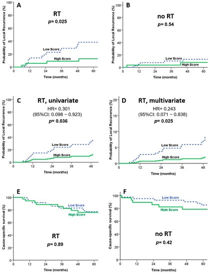 Clinical outcomes according to IRAK2 expression in patients treated with or without RT. (A) Kaplan–Meier survival curves on local control for patients treated with RT. (B) Kaplan–Meier survival curves on local control for patients treated without RT. (C,D) Cox proportional hazard regression confirmed that patients with high IRAK2 expression demonstrated better local control than those with a lower expression in univariate (C) and multivariate (D) analyses. Kaplan–Meier survival curves on cause-specific survival show no statistical difference in the RT (E) and no-RT (F) groups.