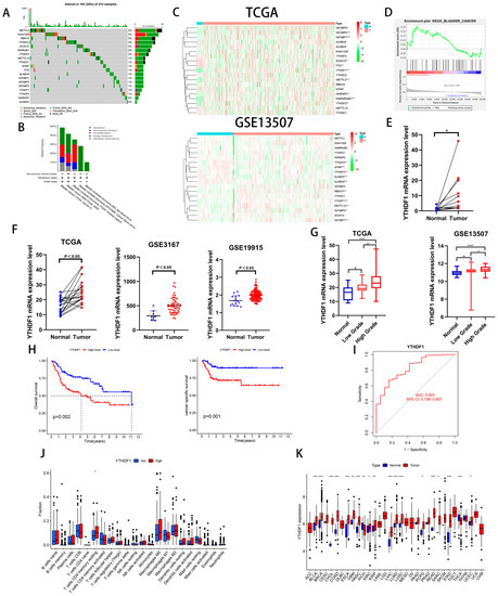 To investigate the role of m6A-related genes in BLCA development, we analyzed the mutation frequency of 19 common m6A-related genes in 412 tumor samples from the TCGA database and found that m6A gene mutations occurred in 103 samples (Figure 1A). We also analyzed the genetic alterations and expression levels of these genes using cBioPortal (cBio Cancer Genomics Portal), a dataset consisting of five BLCA datasets (Figure 1B). Then, we analyzed the expression of the above 19 genes in the TCGA database and GEO13507 dataset and found that 3 genes, IGFBP1, IGFBP2 and YTHDF1, were increased in the BLCA tissues of both datasets (Figure 1C). To clarify our target genes, we performed a single-gene KEGG enrichment analysis on these three genes and found that YTHDF1 was highly enriched in BLADDER CANCER (Figure 1D). To further verify whether YTHDF1 is highly expressed in BLCA, we analyzed 19 pairs of cancerous and paracancerous paired tissues in the TCGA database, 12 pairs of cancerous and paracancerous paired tissues collected by our institution, and the GSE3167 and GSE19915 datasets and found that YTHDF1 was highly expressed in the BLCA tissues (Figure 1E,F). In addition, the expression of YTHDF1 increased with increasing tumor grade in the GSE13507 and TCGA databases (Figure 1G). Next, we found that the overall survival (OS) and cancer-specific survival rates were poor in BLCA patients with a high expression of YTHDF1 in GSE13507 (Figure 1H). The AUC of the YTHDF1 diagnostic curve in the TCGA database was 0.825 and was correlated with memory resting CD4 T cells (Figure 1I,J). We performed a chi-squared test on the clinical characteristics of BLCA patients in GSE13507 with YTHDF1 expression and found that the patients with high YTHDF1 expression were more likely to develop muscle-invasive bladder cancer (Table 1). Finally, we analyzed the expression of YTHDF1 in the TCGA pan-cancer database and found that it was highly expressed in a variety of tumors (Figure 1K). Therefore, we speculate that there is a link between YTHDF1 and the development of BLCA.