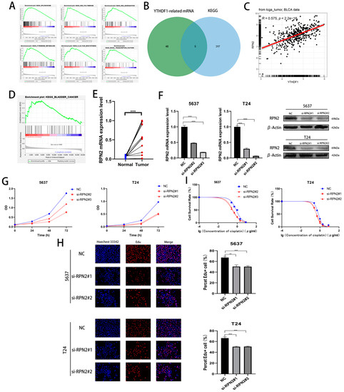 Effect of RPN2 as a downstream target gene of YTHDF1 on the proliferative capacity and cisplatin sensitivity of BLCA cells. (A) YTHDF1 single gene KEGG enrichment analysis of the top six pathways. (B) Intersection of YTHDF1 in the TCGA database with Pearson correlation coefficients greater than 0.4 and hallmark enrichment of the top five pathway genes. (C) Pearson’s correlation coefficient between RPN2 and YTHDF1 in the TCGA bladder cancer database. (D) RPN2 was highly enriched in the KEGG BLADDER CANER. (E) The expression of RPN2 was verified in 12 pairs of cancerous and paraneoplastic tissues collected from BLCA patients in our hospital. (F) Knockdown of RPN2 mRNA and protein in T24 and 5637 cells. (G,H) CCK-8 assay and EdU to validate the effect of RPN2 on the proliferative capacity of BLCA cells. (I) MTT assay to verify the effect of RPN2 on the cisplatin sensitivity of BLCA cells. ** p < 0.01, *** p < 0.001, **** p < 0.0001 or not significant (ns).
