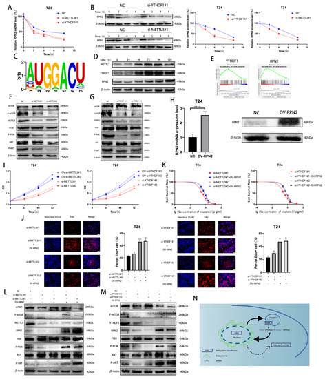 Validation of the METTL3/YTHDF1-RPN2-PI3K/AKT/mTOR axis in BLCA cells. (A,B) The effects of YTHDF1 and METTL3 on RPN2 mRNA and protein levels were verified after Dactinomycin and CHX treatment of T24 cells for 0 h, 2 h, 4 h and 8 h. (C) Prediction of m6A modification sites of RPN2 mRNA. (D) Cisplatin (0.5 μg/mL) was used to treat T24 cells for 0 h, 24 h, 48 h, 72 h, 96 h and 120 h later to verify the protein expression of METTL3, YTHDF1 and RPN2. (E) Single-gene Hallmark analysis found that both YTHDF1 and RPN2 were highly enriched in PI3K-AKT-MTOR SIGNALING. (F,G) Regulation of the PI3K/AKT/mTOR pathway by METTL3 and YTHDF1. (H) Overexpression of RPN2 in T24 cells. (I,J) CCK-8 and EdU assays verified that increased expression of RPN2 could rescue the effects of reduced METTL3 or YTHDF1 expression on T24 cell proliferation. (K) MTT assay verified that increased expression of RPN2 could rescue the effects of reduced METTL3 or YTHDF1 expression on cisplatin sensitivity of T24 cells. (L,M) Effect of overexpression of RPN2 on PI3K/AKT/mTOR when METTL3/YTHDF1 is lowly expressed. (N) Mechanistic sketch of the METTL3/YTHDF1-RPN2-PI3K/AKT/mTOR axis regulating BLCA cell proliferation and cisplatin sensitivity. ** p < 0.01, **** p < 0.0001.