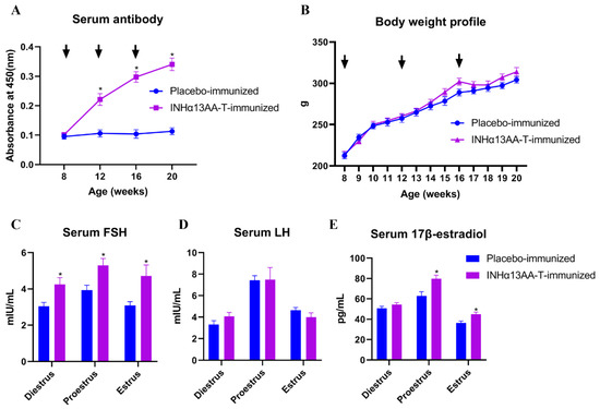 To evaluate the effect of INHα13AA-T immunization on immunological and biological response in female rats, the serum anti-inhibin antibody titers and body weight of female rats were monitored throughout the experimental period, and serum concentrations of FSH, LH and 17β-estradiol were determined at decapitation. Resultantly, INHα13AA-T immunization induced a good antibody response, especially after the booster immunizations (p < 0.05; Figure 1A), but exerted no significant effects on the body weight profile (p > 0.05; Figure 1B). In response to the sharp increase in serum inhibin-specific antibodies, the serum concentrations of FSH at diestrus, proestrus and estrus, as well as 17β-estradiol at proestrus and estrus, were increased (p < 0.05; Figure 1C,E) in INHα13AA-T-immunized females compared with placebo-immunized controls at decapitation. However, the serum LH concentrations were comparable between INHα13AA-T- and placebo-immunized rats at decapitation (p > 0.05; Figure 1D).