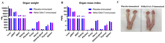 The weights of various organs and their relative weight (i.e., organ index) were measured and calculated at decapitation. Compared with placebo-immunized controls, INHα13AA-T immunization increased (p < 0.05) the thymus weight and index but exerted no effects on the weight or index of any other measured organs, including liver, pWAT, iWAT, kidney, pituitary, adrenal gland and spleen (Figure 3A,B). In particular, neither the weight nor the index of important reproductive organs, ovary and uterus were affected by INHα13AA-T immunization (p > 0.05; Figure 3A–C).